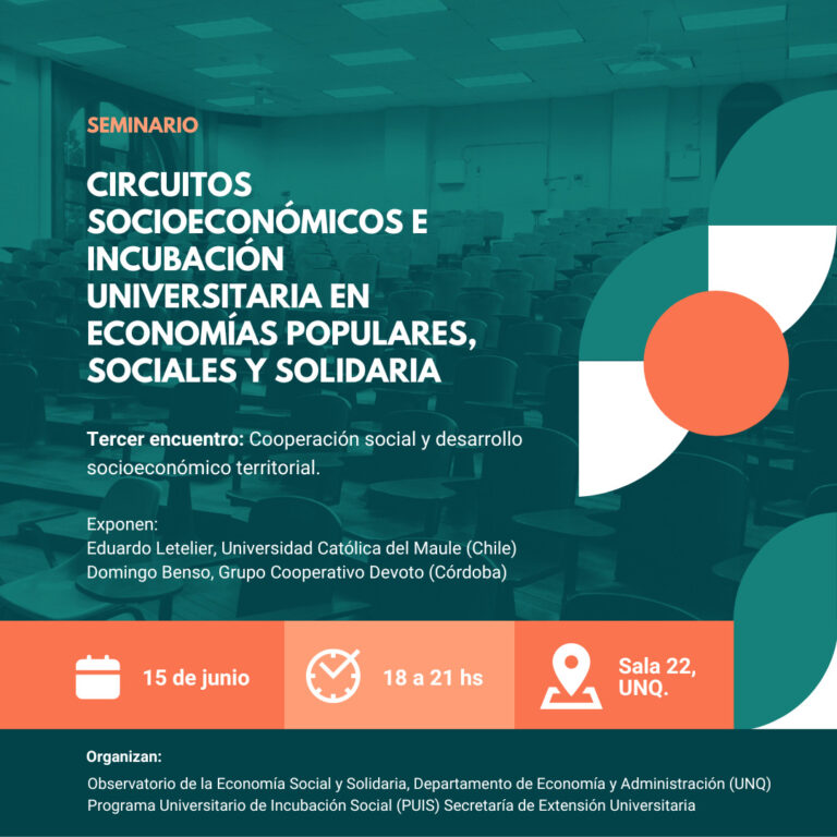 Tercer y último encuentro del Seminario Circuitos Socioeconómicos e Incubación Universitaria en Economías Populares, Sociales y SolidariasBajo el tópico Cooperación Social y Desarrollo Socioeconómico Territorial,