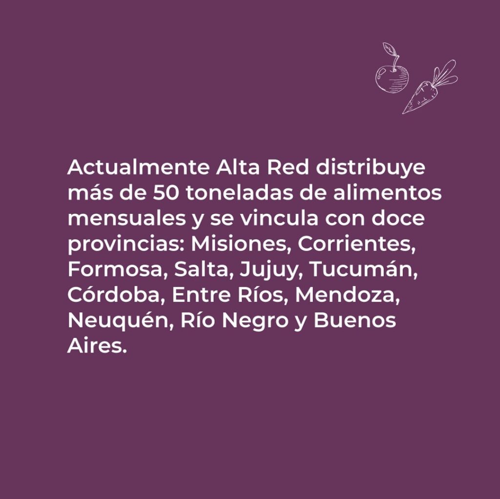 Actualmente Alta Red distribuye más de 50 toneladas de alimentos mensuales y se vincula con doce provincias: Misiones, Corrientes, Formosa, Salta, Jujuy, Tucumán, Córdoba, Entre Ríos, Mendoza, Neuquén, Río Negro y Buenos Aires.