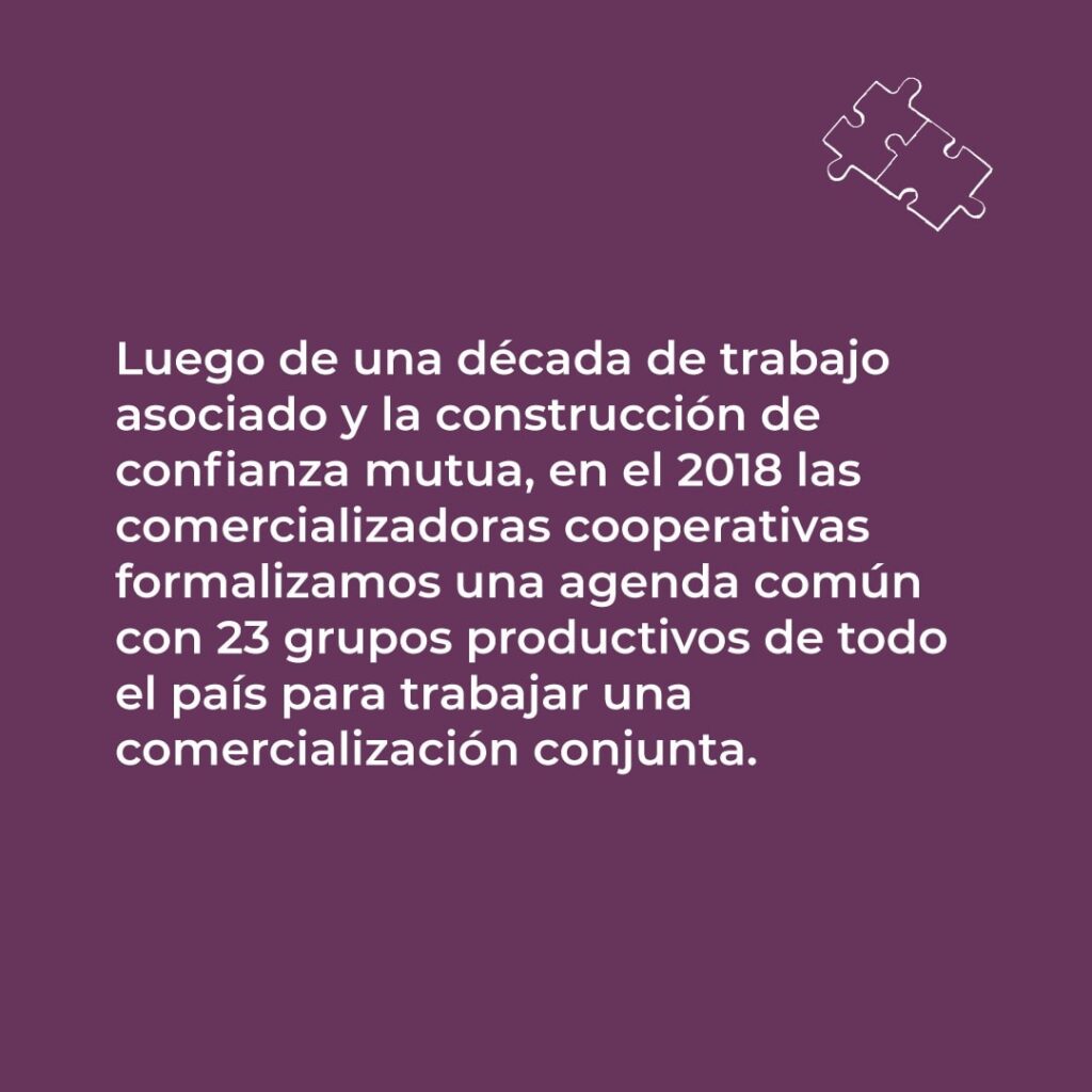 Luego de una década de trabajo asociado y la construcción de confianza mutua, en el 2018 las comercializadoras cooperativas comenzaron a formalizar una agenda común con 23 grupos productivos de todo el país para trabajar una comercialización conjunta.